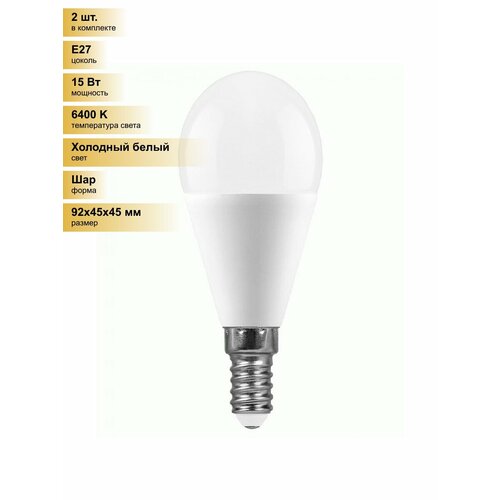 (2 шт.) Светодиодная лампочка Saffit шар G45 E27 15W(1275Lm) 6400K 6K матовая 92×45 SBG4515 55211 Холодный белый. Цоколь E27: сравнение цен, характеристики, фото, актуальное наличие и цены.