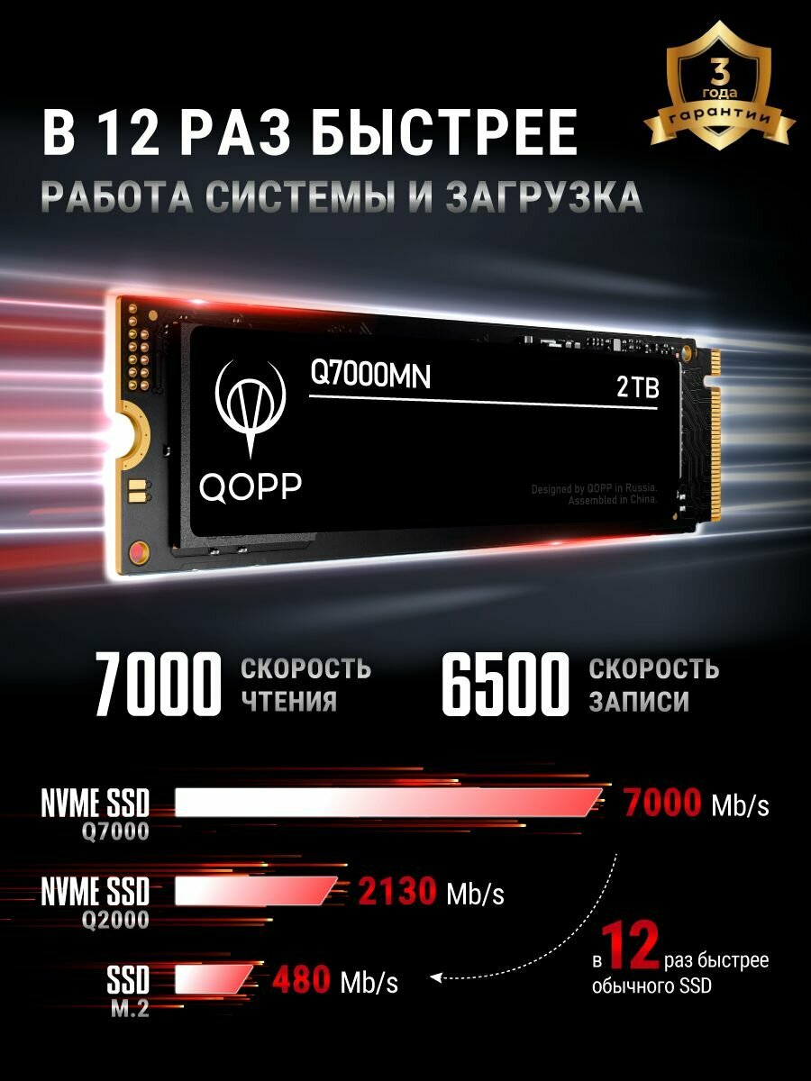 Внутренний SSD-диск QOPP 2TB M.2 NVMe — это современный твердотельный накопитель, который обеспечит высокую скорость работы и мгновенный отклик вашего ПК или ноутбука. Объем 2 ТБ предоставляет достаточно памяти для хранения операционной системы, программ, игр и больших файлов, а компактный форм-фактор M.2 2280 позволяет легко установить накопитель в современные модели компьютеров и ноутбуков без лишних сложностей.