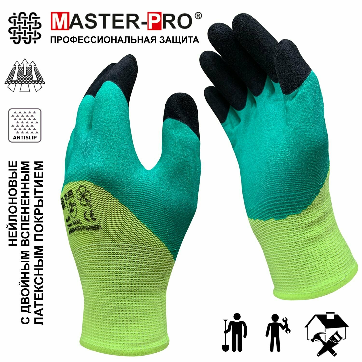 Купить 20 пар. Перчатки рабочие нейлоновые с двойным латексным покрытием Master-Pro торрон грин (2GB), размер 10 (XL) с доставкой по всей России.
