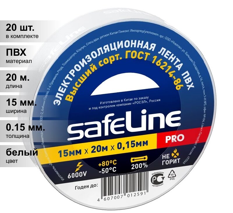 (20 шт.) Изолента ПВХ белая 15мм 20м Safeline Электроизоляционная лента на ПВХ-основе, устойчива к воздействию УФ-лучей, влажности, истиранию, коррозии металлов, старению. Не горюча. Предназначена для проведения электромонтажных работ: