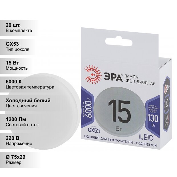 Купить (20 шт.) Светодиодная лампочка ЭРА 15Вт 6000К 220В GX53 с доставкой по всей России.