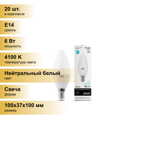 (20 шт.) Светодиодная лампочка Gauss Elementary Свеча E14 6W(450lm) 4100K 4K 100×37 матовая, пластик/алюм. 33126 Нейтральный белый. Цоколь E14: сравнение цен, характеристики, фото, актуальное наличие и цены.