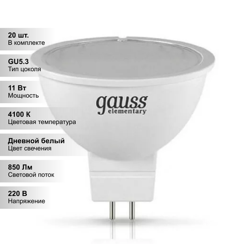 Gauss LED Elementary MR16 11W 850lm 4100K GU5.3 Линейка Elementary - для тех, кто хочет получить светодиодные лампы по доступной цене. Мы бы рекомендовали эту серию для технических помещений.