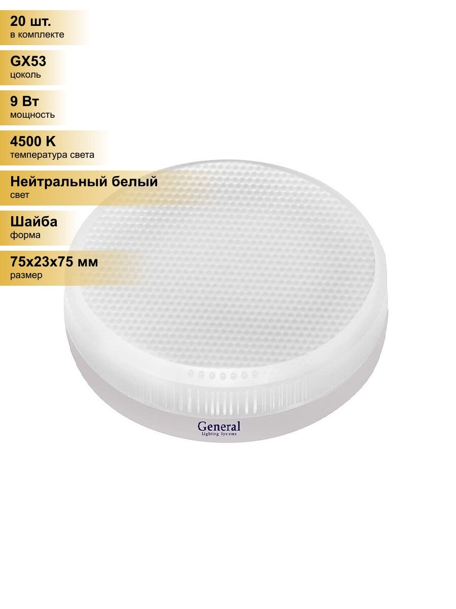 (20 шт.) Светодиодная лампочка General GX53 9W 4500K 4K 75×23 призма пластик GLDEN-GX53-9-230-GX53-4500 660363 Нейтральный белый. Цоколь GX53: сравнение цен, характеристики, фото, актуальное наличие и цены.