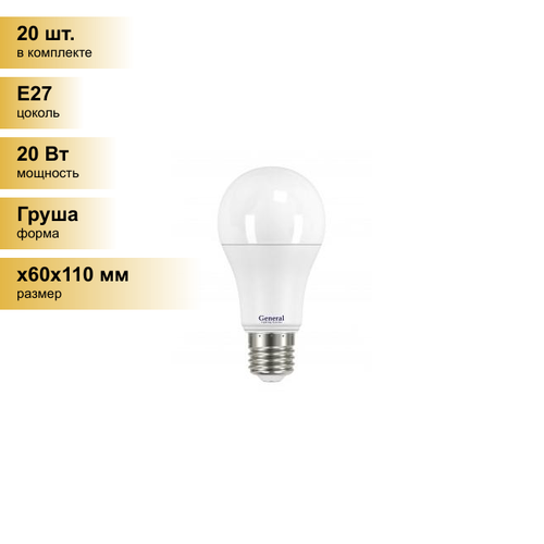 (20 шт.) Светодиодная лампочка General ЛОН A60 E27 20W 6500K 6K 60×110 пластик/алюмин. 690100 Холодный белый. Цоколь E27: сравнение цен, характеристики, фото, актуальное наличие и цены.