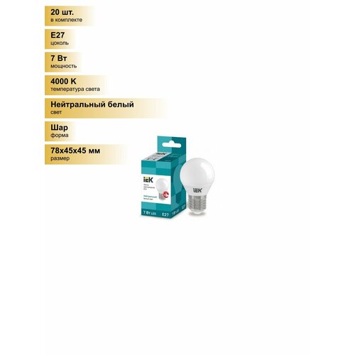 (20 шт.) Светодиодная лампочка IEK шар G45 E27 7W(630lm) 4000K 4K 78×45 матов. ECO LLE-G45-7-230-40-E27 Нейтральный белый. Цоколь E27: сравнение цен, характеристики, фото, актуальное наличие и цены.
