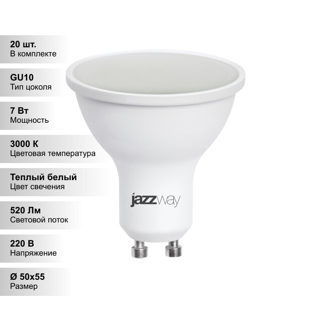 Купить (20 шт.) Светодиодная лампочка Jazzway 7Вт 230В 3000K GU10 с доставкой по всей России.