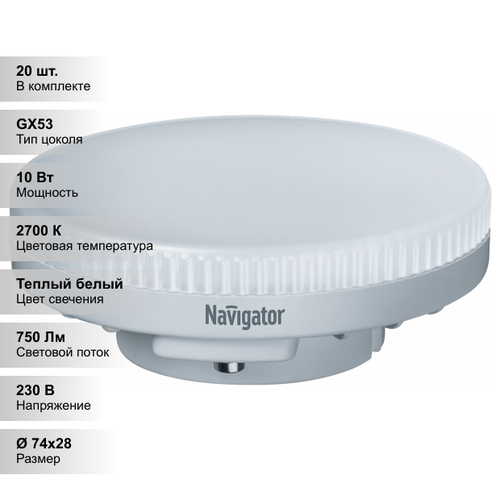 Купить (20 шт.) Светодиодная лампочка Navigator, мощность 10 Вт, напряжение питания 220 В, цветовая температура 2700 К, теплый белый свет, цоколь GX53, таблетка, размер 74х28 мм с доставкой по всей России. (20 шт.) Светодиодная лампочка Navigator, мощность 10 Вт, напряжение питания 220 В, цветовая температура 2700 К, теплый белый свет, цоколь GX53, таблетка, размер 74х28 мм: сравнение цен, характеристики, фото, актуальное наличие и цены.