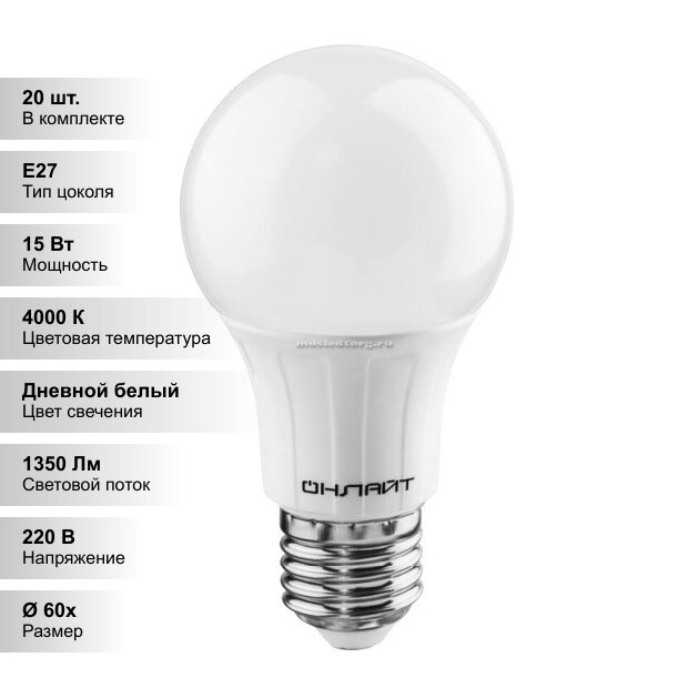 (20 шт.) Светодиодная лампочка онлайт A60 15Вт 230В 4000K E27: сравнение цен, характеристики, фото, актуальное наличие и цены.