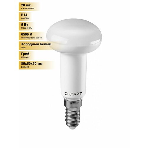 (20 шт.) Светодиодная лампочка онлайт R50 E14 5W(440Lm) 6500K 6K 85×50 OLL-R50-5-230-6.5K-E14 61142 Холодный белый. Цоколь E14: сравнение цен, характеристики, фото, актуальное наличие и цены.