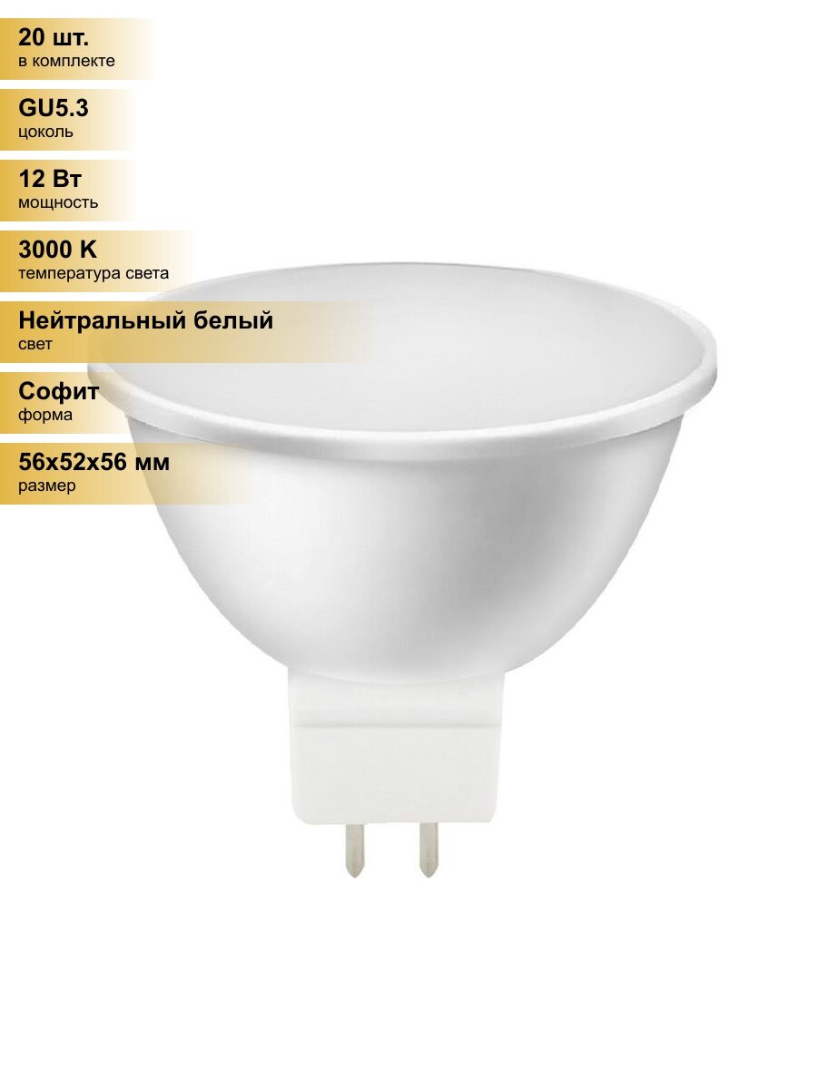 (20 шт.) Светодиодная лампочка Smartbuy MR16 GU5.3 12W (960 lm) 3000К 3К 52х56 матовая пластик SBL-GU5_3-12-30K Нейтральный белый. Цоколь GU5.3: сравнение цен, характеристики, фото, актуальное наличие и цены.