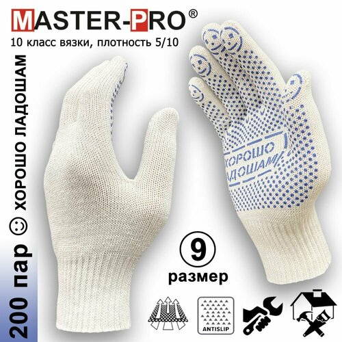 200 пар. Категория А. Перчатки рабочие х/б Master-Pro хорошо ладошам, 10 класс вязки, ПВХ покрытие, плотность 5/10, р. 9: сравнение цен, характеристики, фото, актуальное наличие и цены.