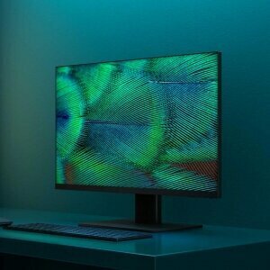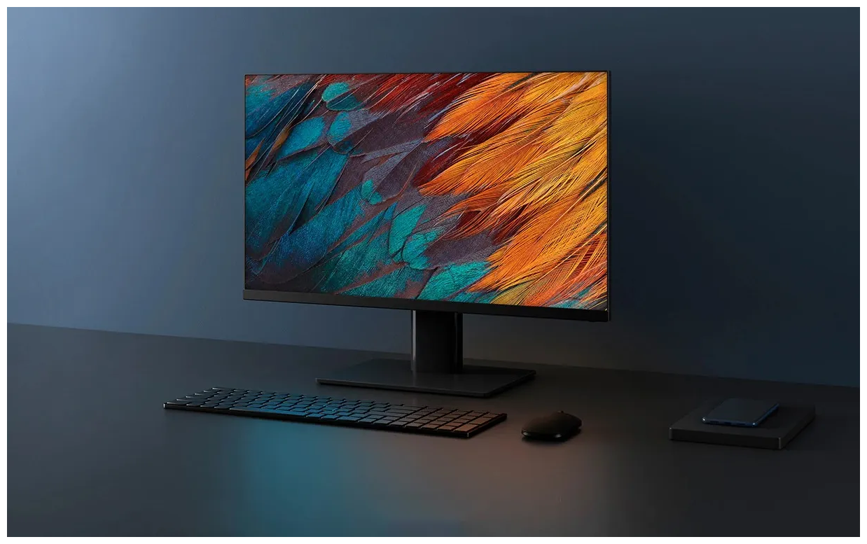 Монитор Xiaomi Mi Display 23.8 черного цвета с минимальными рамками и яркими цветамиМонитор Xiaomi Mi Display 23.8 обладает широким углом обзора, яркими и насыщенными цветами. Высокое разрешение и максимальная частота обновления способствуют тому, чтобы устройство работало быстро, а картинка загружалась плавно. ДизайнУстройство имеет безрамочный экран. Только в самом низу представлена небольшая полоска, под которой расположены элементы управления. Это пять кнопок, которые нужны для включения прибора, регулировки громкости, настройки и других действий. Выполнена конструкция из крепкого противоударного пластика черного цвета. Корпус максимально тонкий с ровными чертами. Порты HDMI и питания интегрированы в подставку, что предотвращает скопление на столе проводов. ЭкранМонитор обладает диагональю 23,8 дюймов. Это качественная IPS-матрица, которая гарантирует угол обзора в 178 градусов. Картинка видна с любой стороны, ее цвета не меняются, не искажаются. Она радует отличной детализацией и цветопередачей, что обеспечено разрешением 1080р. На изображении, которое выводится на монитор, натуральные цвета, прорисовываются любые мелкие детали. Сверхузкие рамки способствуют увеличению площади экрана. Они делают изображение более легким для восприятия. Mi Display оборудован функцией, которая позволяет объединить несколько экранов и получить один большой.