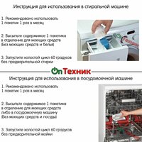 - Для стиральных машин: Откройте пакетик и поместите продукт в соответствующий контейнер. Запустите цикл стирки без белья, без предварительного полоскания, без моющих средств, температура 60 градусов.