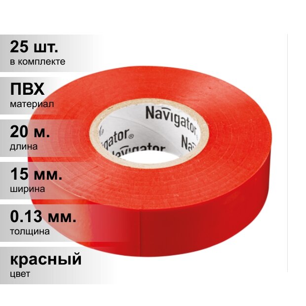(25 шт.) Изолента ПВХ красная 15мм 20м Navigator NIT-B15-20/R 71 104 Электроизоляционная лента (изолента) Navigator серии NIT на основе ПВХ - расходный материал при электротехнических работах, используемый для обмотки проводов и кабелей с целью их электроизоляции. Изолента общего применения 0,13x15 мм Цвет красная Ширина ленты 15 мм Длинна рола 20 м