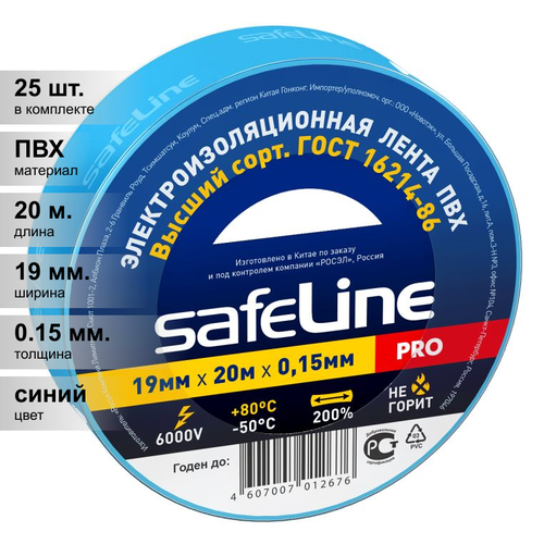 (25 шт.) Изолента ПВХ синяя 19мм 20м Safeline Электроизоляционная лента на ПВХ-основе, устойчива к воздействию УФ-лучей, влажности, истиранию, коррозии металлов, старению. Не горюча. Предназначена для проведения электромонтажных работ: