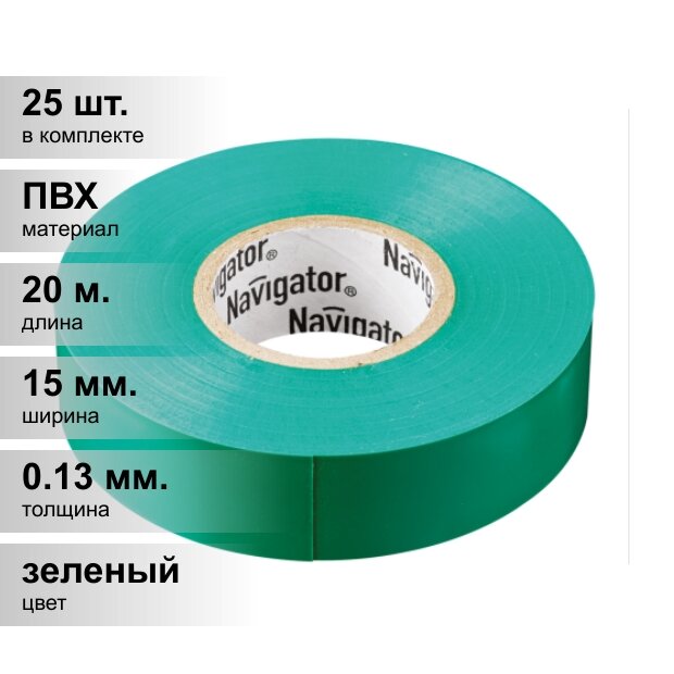(25 шт.) Изолента ПВХ зеленая 15мм 20м Navigator NIT-B15-20/G 71 106 Электроизоляционная лента (изолента) Navigator серии NIT на основе ПВХ - расходный материал при электротехнических работах, используемый для обмотки проводов и кабелей с целью их электроизоляции. Изолента общего применения 0,13x15 мм Цвет зеленая Ширина ленты 15 мм Длинна рола 20 м
