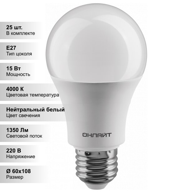 Купить (25 шт.) Светодиодная лампочка онлайт A60 15Вт 230В 4000K E27 с доставкой по всей России. (25 шт.) Светодиодная лампочка онлайт A60 15Вт 230В 4000K E27: сравнение цен, характеристики, фото, актуальное наличие и цены.