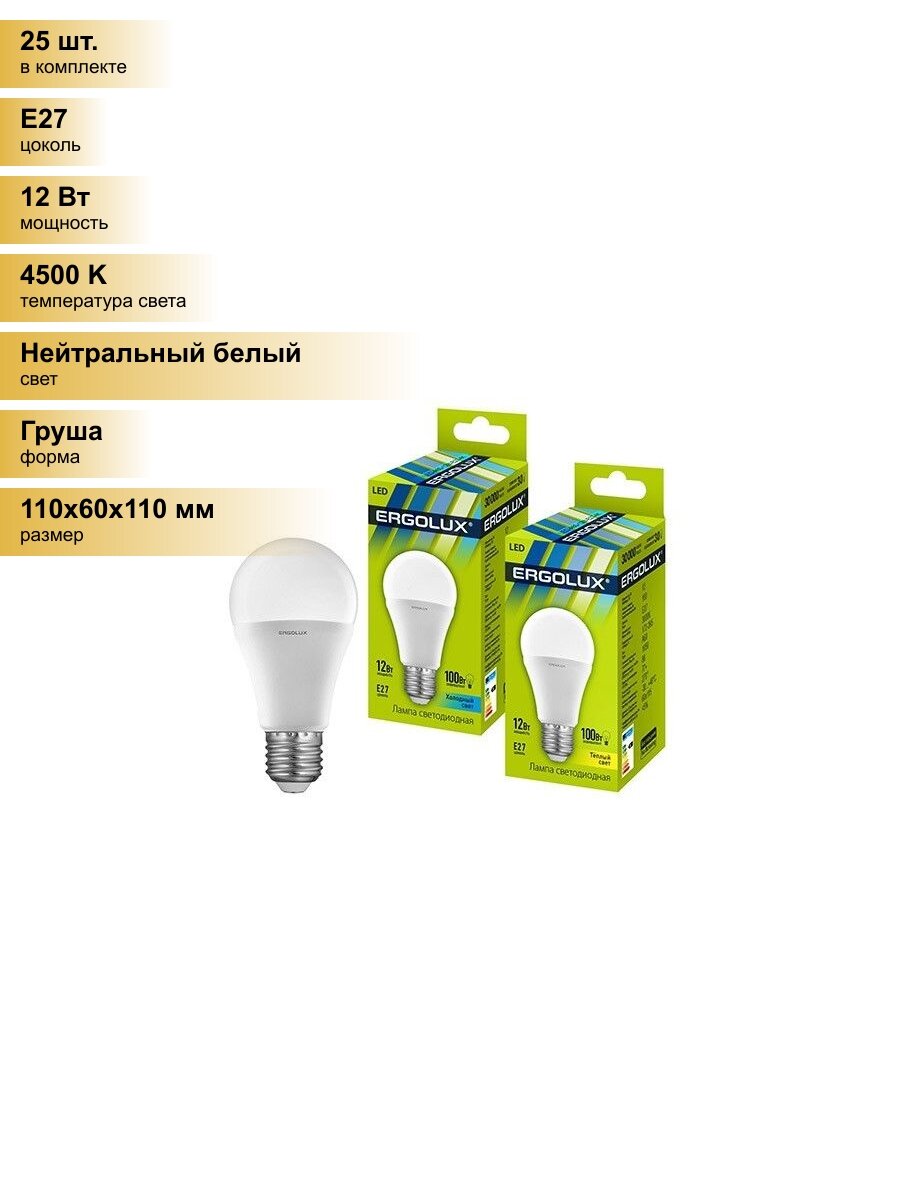 (25 шт.) Светодиодная лампочка Ergolux ЛОН A60 E27 12W(1100lm 270°) 4500K 4K матовая 110×60 пластик/алюм. LED-A60-12W-E27-4K Нейтральный белый. Цоколь E27: сравнение цен, характеристики, фото, актуальное наличие и цены.