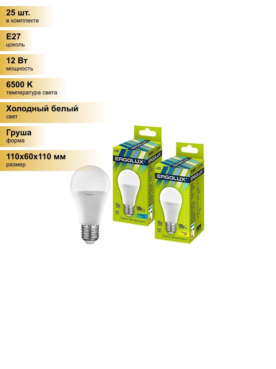 (25 шт.) Светодиодная лампочка Ergolux ЛОН A60 E27 12W(1150lm 270°) 6500K 6K матовая 110×60 пластик/алюм. LED-A60-12W-E27-6K Холодный белый. Цоколь E27: сравнение цен, характеристики, фото, актуальное наличие и цены.