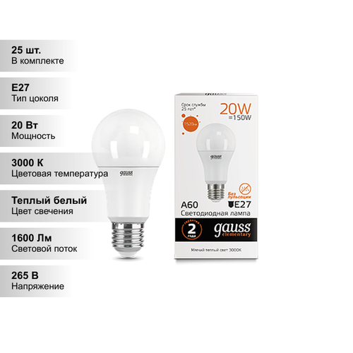 Светодиодная лампа Gauss Elementary А60 20Вт 150-265Вт 2700K/3000К E27 Светодиодная лампа Gauss LED 23219 теплого свечения мощностью 20 Вт представляет собой энергосберегающий источник света, в котором светообразующими элементами являются диоды. Она изготовлена по европейским стандартам и относится к классу энергоэффективности «А+». Данная модель предназначена для внутреннего освещения общественных и производственных помещений, интерьерной декоративной подсветки, общего, локального, акцентного и аварийного освещения.