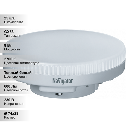 Купить (25 шт.) Светодиодная лампочка Navigator, мощность 8 Вт, напряжение питания 220 В, цветовая температура 2700 К, теплый белый свет, цоколь GX53, таблетка, размер 74х28 мм с доставкой по всей России. (25 шт.) Светодиодная лампочка Navigator, мощность 8 Вт, напряжение питания 220 В, цветовая температура 2700 К, теплый белый свет, цоколь GX53, таблетка, размер 74х28 мм: сравнение цен, характеристики, фото, актуальное наличие и цены.