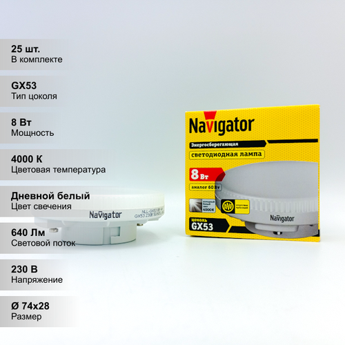 (25 шт.) Светодиодная лампочка Navigator, мощность 8 Вт, напряжение питания 220 В, цветовая температура 4000 К, нейтральный белый свет, цоколь GX53, таблетка, размер 74х28 мм