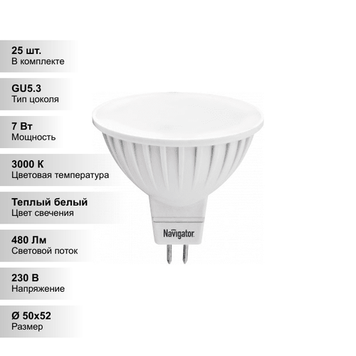 (25 шт.) Светодиодная лампочка Navigator MR16, мощность 7 Вт, напряжение питания 220 В, цветовая температура 3000 K, теплый белый свет, цоколь GU5.3, размер Ø50х52 мм