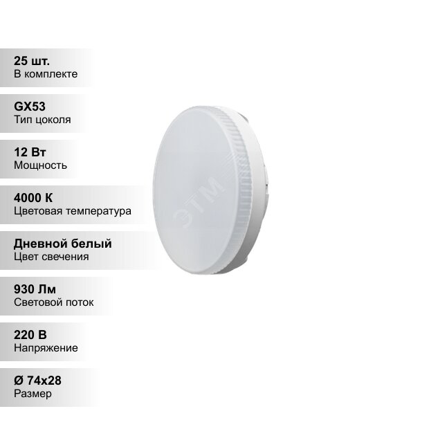 Онлайт OLL-GX53-12-230-4K 61 191 Лампа светодиодная LED 12вт GX53 белый таблетка (61191 OLL-GX53) Покрытие колбы Матовая Форма колбы Таблетка Срок службы, ч 30000 Цвет свечения Белый