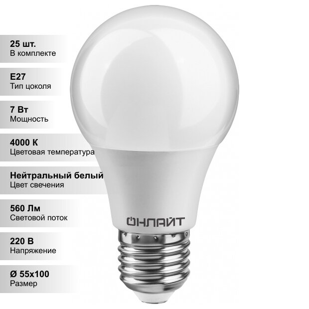 Онлайт ОLL-A60-7-230-4K-E27 71 648 Лампа светодиодная LED 7вт Е27 белый онлайт (71648 ОLL-A60) Высота, мм 106 Диаметр внешний, мм 60 Тип изделия Лампа Мощность, Вт 7 Тип цоколя E27 Цветовая температура 4000 Покрытие колбы Матовая Форма колбы Грушевидная Срок службы, ч 30000
