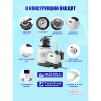 | Дополнительная информация | диаметр шлангов 38 мм, длина 1,5; в комплектацию не входит песок, песок приобретается дополнительно; фильтрующий насос подключается к штатным системам в бассейне Intex |