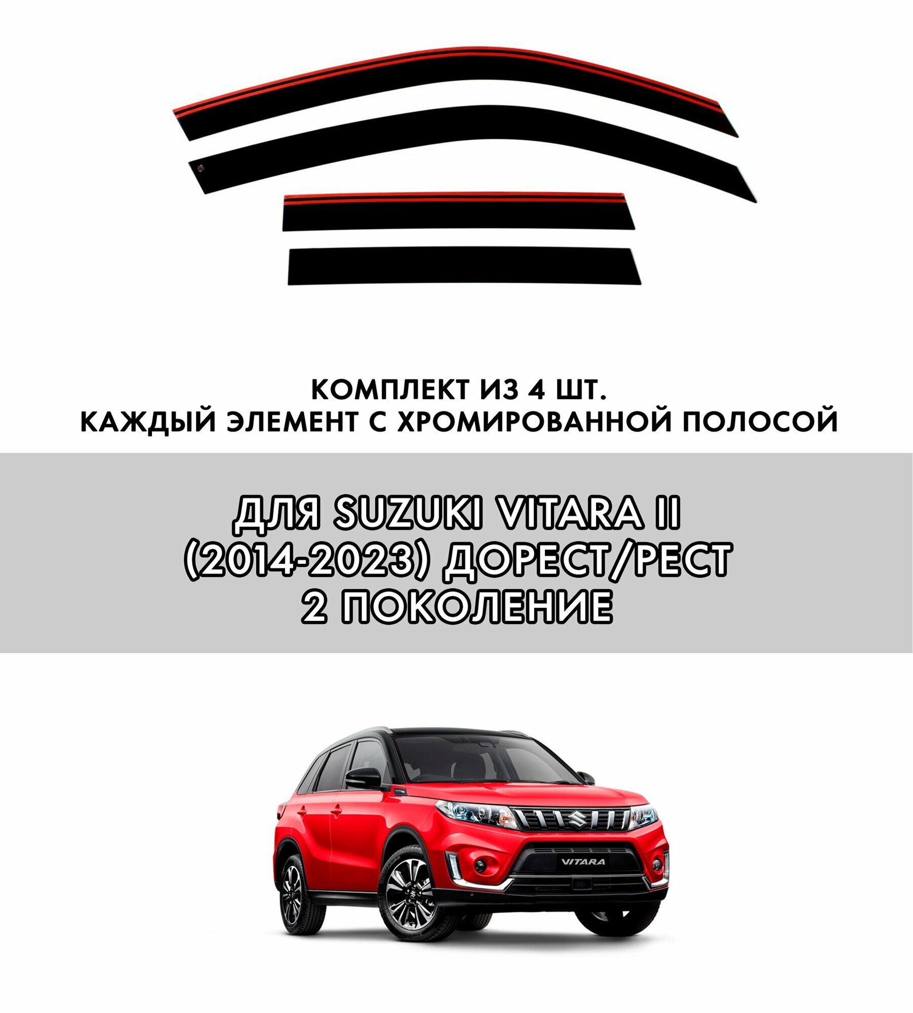 Купить 2D дефлекторы с хромом для окон Suzuki Vitara 2 (2014-2021) / Ветровики для Сузуки Витара 2 поколение. Комплект 4 шт. с доставкой по всей России. 2D дефлекторы с хромом для окон Suzuki Vitara 2 (2014-2021) / Ветровики для Сузуки Витара 2 поколение. Комплект 4 шт.: сравнение цен, характеристики, фото, актуальное наличие и цены.