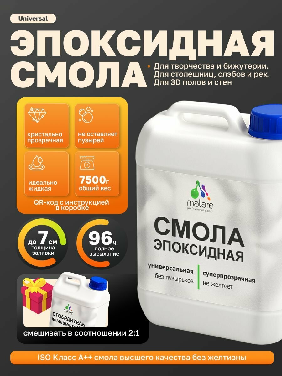2К Эпоксидная смола Malare универсальная, двухкомпонентная кристально-прозрачная, самовыравнивающаяся высокопрочная, без запаха (5 кг+2.5 кг отвердитель)