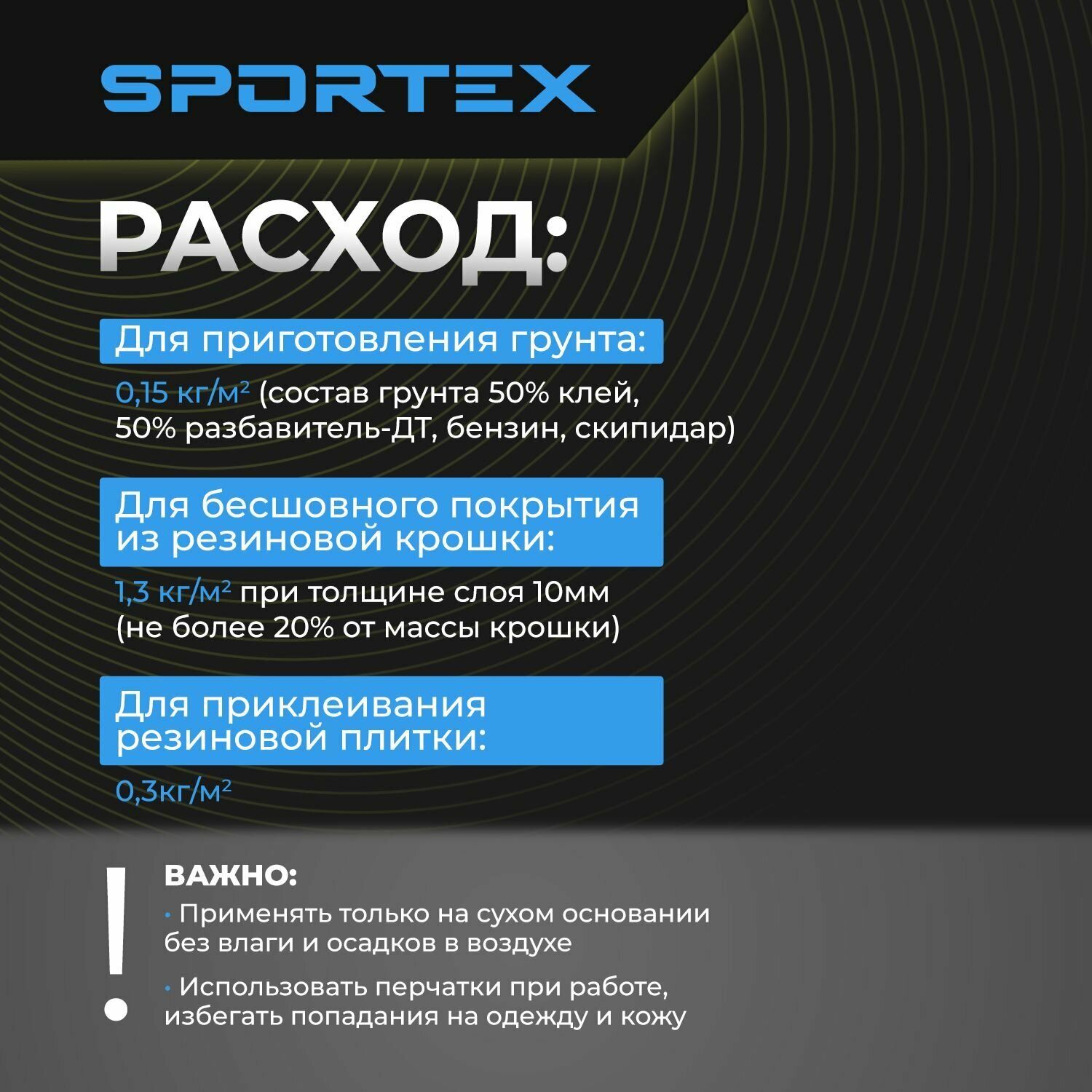 Полиуретановый клей для резиновой крошки SPORTEX: — это высокоэффективный клей, предназначенный для резиновых покрытий- изготовления бесшовного резинового покрытия, грунтовочной смеси- ПУ праймера, приклеивания резиновой плитки. Наш клей гарантирует прочное и долговечное соединение, устойчивое к любым погодным условиям и эксплуатации. Преимущества: прочная связь между частицами резиновой крошки, великолепная адгезия и долговечность. Устойчивость к атмосферным воздействиям: Эластичность: Клей сохраняет эластичность после отверждения, что позволяет ему выдерживать движение и вибрацию без растрескивания или отслаивания. Умеренное застывание: Клей позволяет избежать проблем, связанных с быстрым отверждением и позволяет качественно выполнить работу. Простота нанесения: Клей легко наносится с помощью кисти или валика. Области применения: создание бесшовных покрытий из резиновой крошки на игровых площадках, спортивных площадках, беговых дорожках. Приклейка резиновой плитки, Ремонт и восстановление резиновых поверхностей. Если Вам необходим высококачественный клей для надежного склеивания резиновой крошки, наш полиуретановый клей — идеальный выбор. Его прочность, устойчивость к атмосферным воздействиям, эластичность и простота нанесения делают его незаменимым инструментом для различных проектов с использованием резиновой крошки.