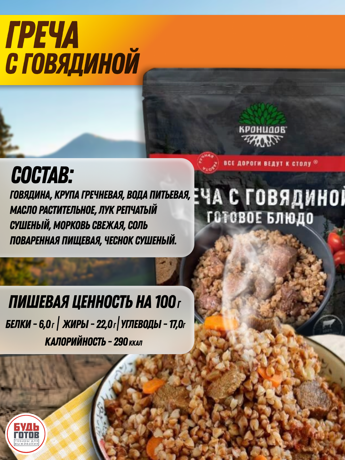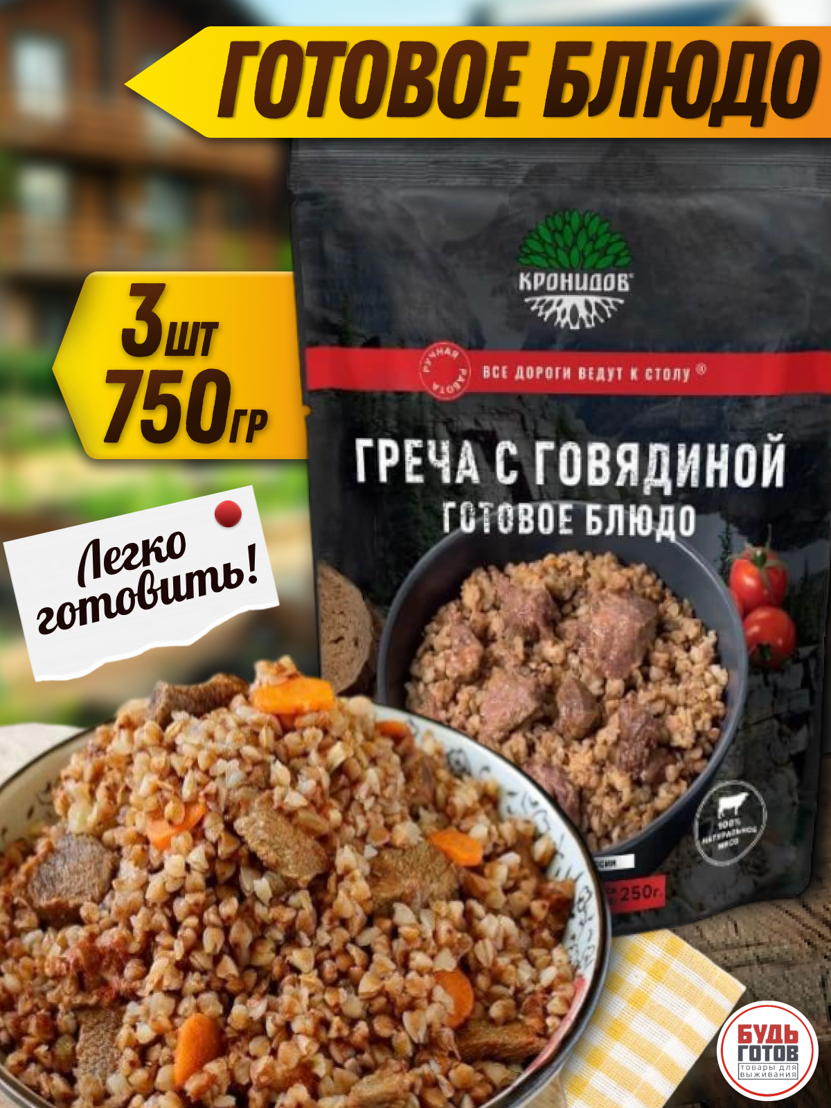 3 шт. Кронидов готовое блюдо Греча с говядиной , 250 г, собой / в поход / готовая еда / туризм / в поезд / в дорогу: сравнение цен, характеристики, фото, актуальное наличие и цены.