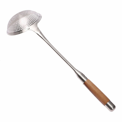 Эта узбекская шумовка, предназначенная для работы с казаном, станет незаменимым помощником на вашей кухне. С общей длиной в 51 сантиметр, она обеспечивает комфортную работу с большими объемами продуктов, а также позволяет держать руки на безопасном расстоянии от горячего масла или кипящего бульона. Диаметр рабочей части шумовки составляет 14 сантиметров, что оптимально для извлечения овощей, мяса, пельменей и других ингредиентов из казана. Ее чашеобразная форма с отверстиями эффективно отцеживает жидкость, позволяя забирать из казана только твердую часть блюда.