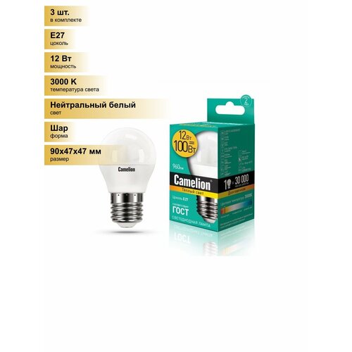 (3 шт.) Светодиодная лампочка Camelion Шар G45 E27 12W(960lm 220°) 3000K 2K матов. 90×47 пластик LED12-G45/830/E27 Нейтральный белый. Цоколь E27: сравнение цен, характеристики, фото, актуальное наличие и цены.
