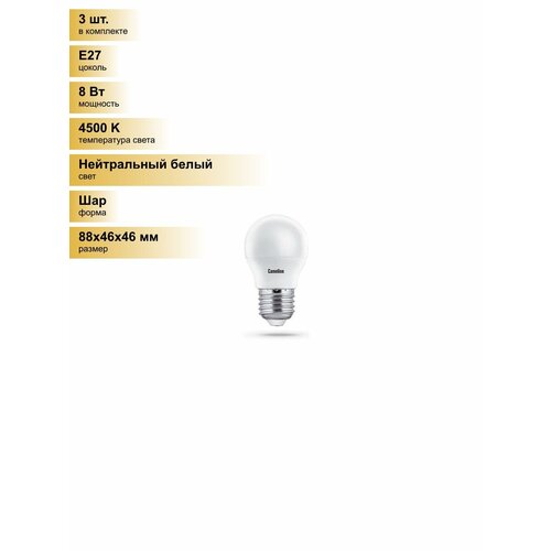 (3 шт.) Светодиодная лампочка Camelion Шар G45 E27 8W(750lm 220°) 4500K 4K матов. 88×46 пластик LED8-G45/845/E27 Нейтральный белый. Цоколь E27: сравнение цен, характеристики, фото, актуальное наличие и цены.