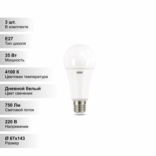 (3 шт.) Светодиодная лампочка Gauss Elementary A67 35Вт 150-265В 4100K E27
