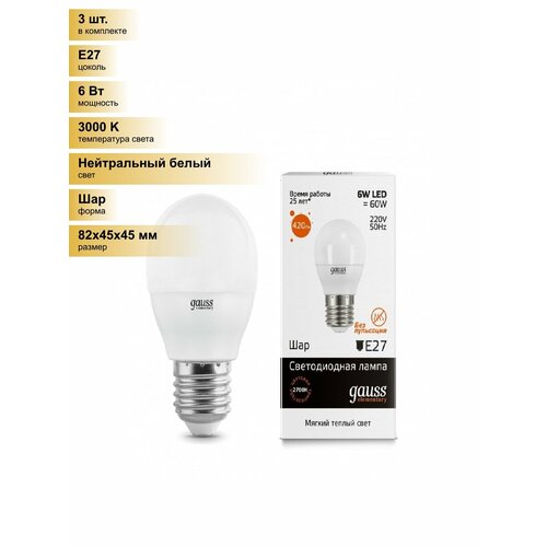 (3 шт.) Светодиодная лампочка Gauss Elementary Шар G45 E27 6W(420lm) 3000K 2K 82×45 матовая, пластик/алюм. 53216 Нейтральный белый. Цоколь E27: сравнение цен, характеристики, фото, актуальное наличие и цены.