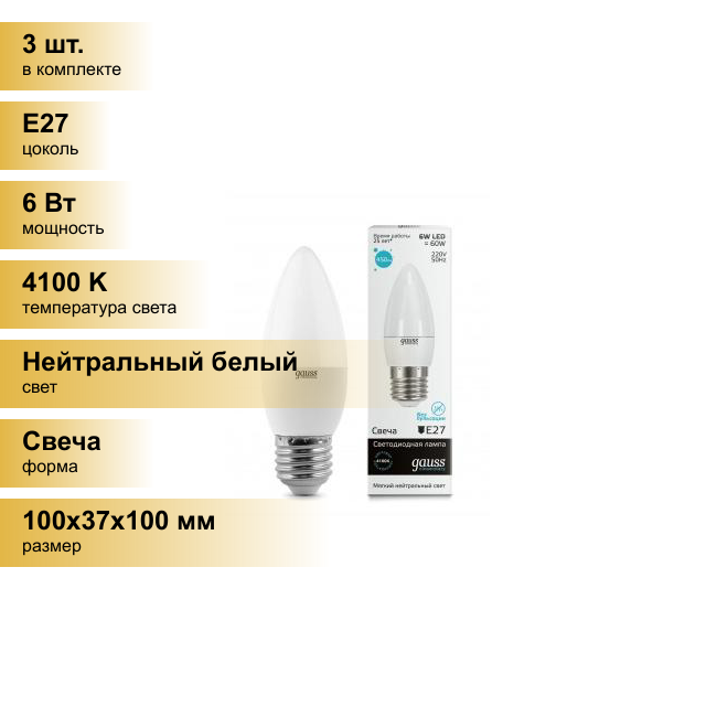 (3 шт.) Светодиодная лампочка Gauss Elementary Свеча E27 6W(450lm) 4100K 4K 100×37 матовая, пластик/алюм. 33226 Нейтральный белый. Цоколь E27: сравнение цен, характеристики, фото, актуальное наличие и цены.