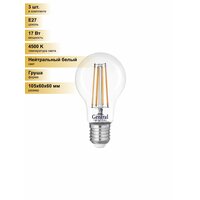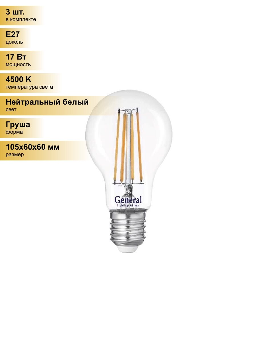 (3 шт.) Светодиодная лампочка General ЛОН A60 E27 17W 4500K 4K 60×105 филамент (нитевидная) прозр. 660320 Нейтральный белый. Цоколь E27: сравнение цен, характеристики, фото, актуальное наличие и цены.