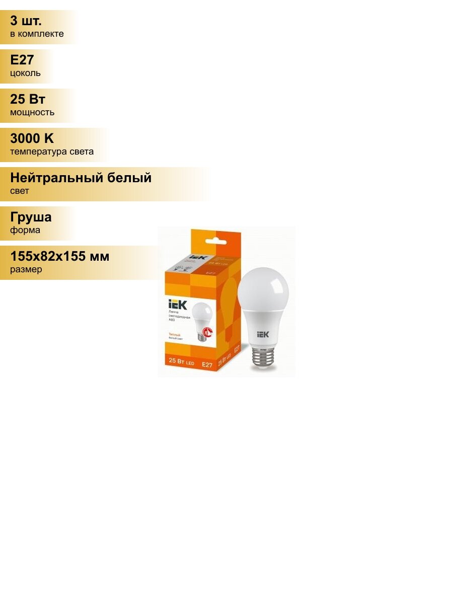 (3 шт.) Светодиодная лампочка IEK ЛОН A80 E27 25W(2500lm) 3000К 2K матовая 155x82x82 LLE-A80-25-230-30-E27 Нейтральный белый. Цоколь E27: сравнение цен, характеристики, фото, актуальное наличие и цены.