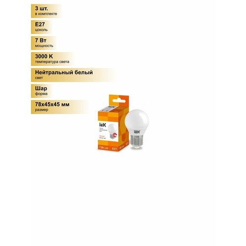 (3 шт.) Светодиодная лампочка IEK шар G45 E27 7W(630lm) 3000K 2K 78×45 матов. ECO LLE-G45-7-230-30-E27 Нейтральный белый. Цоколь E27: сравнение цен, характеристики, фото, актуальное наличие и цены.