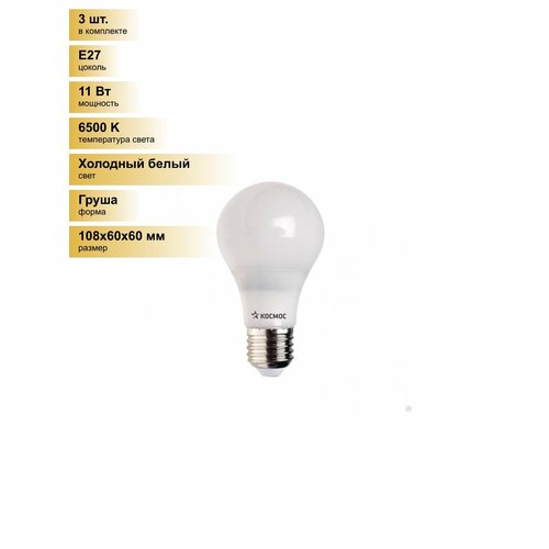 (3 шт.) Светодиодная лампочка Космос ЛОН A60 E27 11W (870lm) 6500K 6K матов. 108×60 LkecLED11wA60E2765 Холодный белый. Цоколь E27: сравнение цен, характеристики, фото, актуальное наличие и цены.