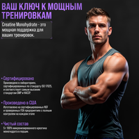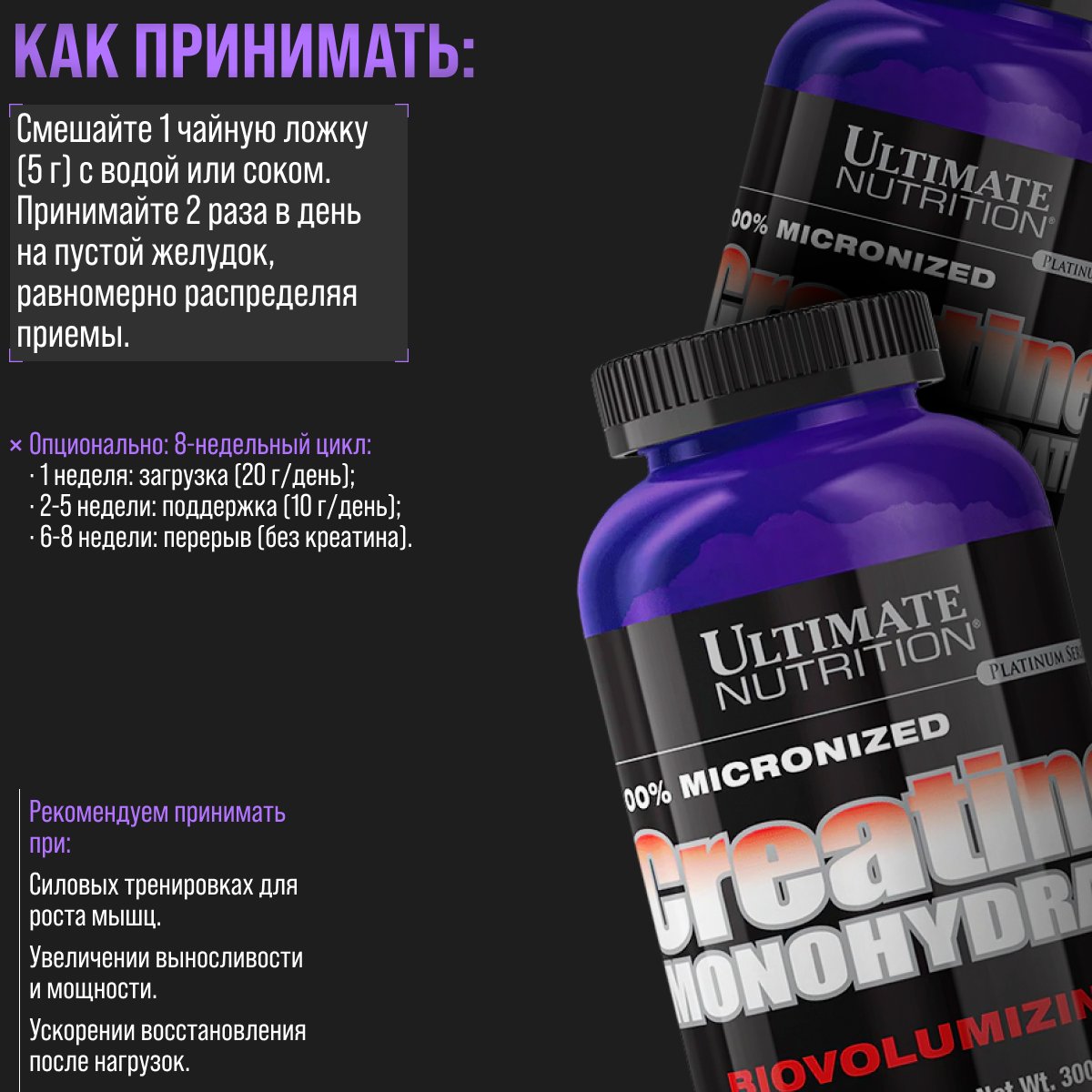 Creapure от Ultimate Nutrition - Высокая результативность при восстановлении сил после интенсивных физических нагрузок. За выработку абсолютного большинства энергии в организме отвечают митохондрии – структуры внутри клеток. И чем быстрее и больше им удается производить молекул АТФ, тем выносливее становится человек, его сила повышается и мышцы начинают восстанавливаться быстрее. За производительность митохондрий во многом отвечает креатин – естественное соединение, присутствующие в организме каждого человека. При помощи добавки Ultimate Nutrition Creapure каждый спортсмен сможет значительно повысить в своем теле концентрацию креатина, заставляя митохондрии делать его сильнее, выносливее и больше! При повседневной нагрузке, организму хватает ресурсов для поддержания необходимого уровня креатина, составляющего примерно 2 грамма в сутки. Креатин содержится в мясных продуктах и в меньшем количестве в растительной пище. Но при регулярных физических нагрузках, получаемого из пищи креатина становится уже недостаточно для функционирования митохондрий на полную мощность. В результате, выносливость спортсмена резко снижается, мышечная ткань начинает восстанавливаться медленнее, создавая условия для возникновения состояния перетренированности. Прием же Ultimate Nutrition Creapure позволяет в кратчайшие сроки повысить содержание креатина в мышечных клетках, используя для этого прекрасно зарекомендовавшую себя форму данного вещества уже на протяжении 20-ти с лишним лет! Отзывы спортсменов подтверждают огромную эффективность этого препарата в вопросах повышения выносливости, ускорения роста мышц и силы. Так одни только показатели жима лежа нередко возрастают на 10 кг уже через месяц использования дополнительного приема креатина моногидрата. Подобные эффекты возможны за счет стимулирования митохондрий к производству большего объема энергетических молекул АТФ. Чем выше их концентрация в мышечных тканях, тем больший объем волокон получится активизировать во время физической работы. Если раньше организму приходилось из экономии выключать какие-то мышечные волокна из работы, то с приемом Ultimate Nutrition Creapure вы сможете раскрыть весь потенциал силы своих мышц! Показатели выносливости также существенно повысятся благодаря увеличившейся скорости восстановления расходуемых по ходу тренинга АТФ. Этот факт позволит сделать перерывы между тренировочными сетами короче, а общую продолжительность занятий в зале длиннее без снижения ее эффективности. Но самое главное, что прием креатина способствует и ускоренному росту мышц в сжатые сроки! Это происходит благодаря возможности креатина накапливать и удерживать в мышечных клетках значительные объемы воды. Подобная гипергидрация быстро повышает объем клеток, но не создает в теле отечных областей, делая мускулатуру только рельефнее. К тому же, повышенный энергетический статус мышц даже по окончанию тренировок существенно упрощает усвоение ими аминокислот и синтез из них белка. Использование Creapure от Ultimate Nutrition абсолютно безопасно для здоровья, что подтверждают не только независимые научные исследования, но и 20-ти летняя практика использования креатина моногидрата в спорте.