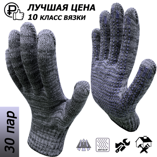 30 пар. ГОСТ 12.4.246-2008, ТР ТС 019/2011. Трикотажные рабочие перчатки с ПВХ покрытием ладонной части. Трикотаж 10 класса вязки, линейная плотность 117 текст, вес 37 гр/пара, длина 23 см. Перчатки средней плотности, обеспечивают высокую тактильную чувствительность. Плотность 6/10. Очень удобные, максимально комфортная посадка по руке, обеспечивают превосходную эргономик. Лидер популярности, лучшее в категории соотношение качество/цена. Предназначены для общехозяйственных работ, а также для защиты от производственных загрязнений. ПВХ покрытие улучшает сцепные свойства и увеличивает стойкость к истиранию.