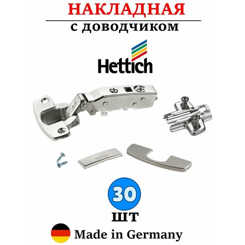 Петля c доводчиком Hettich Sensys, монтажная планка с евровинтами с дистанцией 3мм, заглушка на плечо петли с логотипом Hettich, заглушка на чашку, саморезы 3,5х16мм
