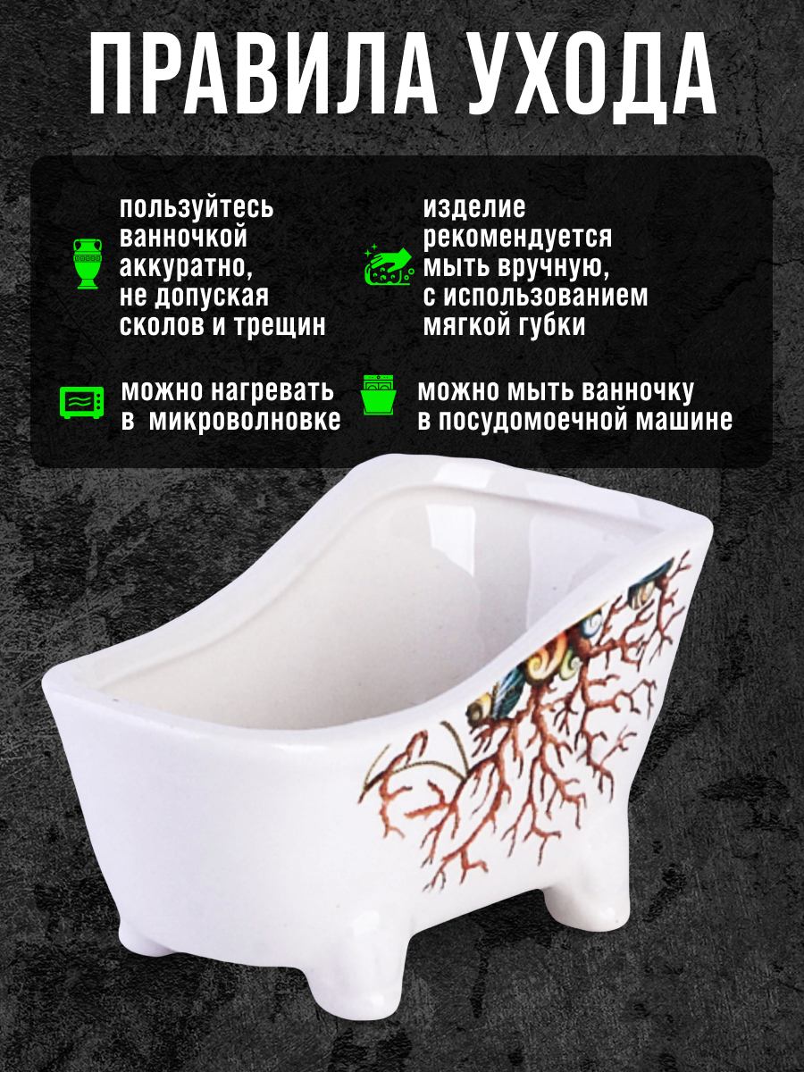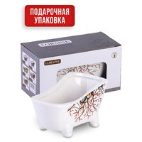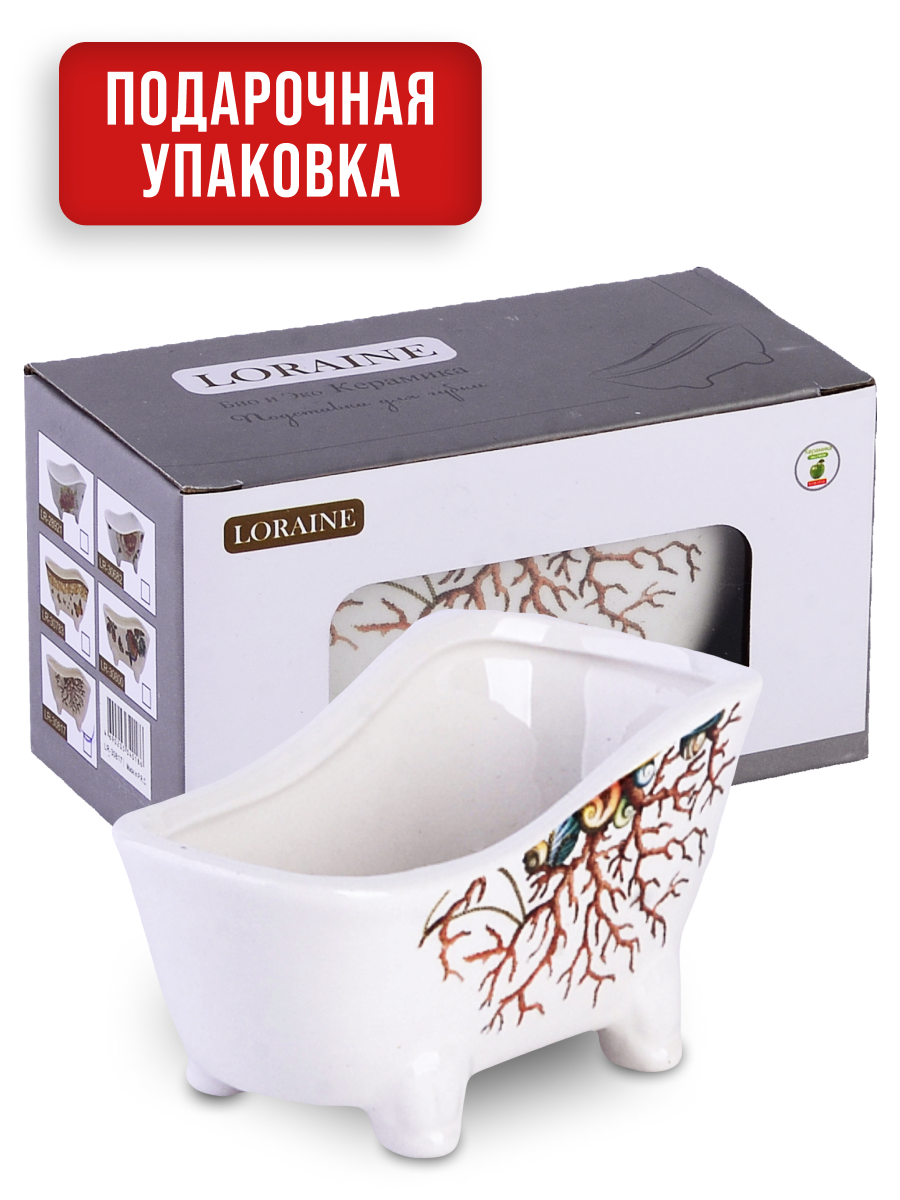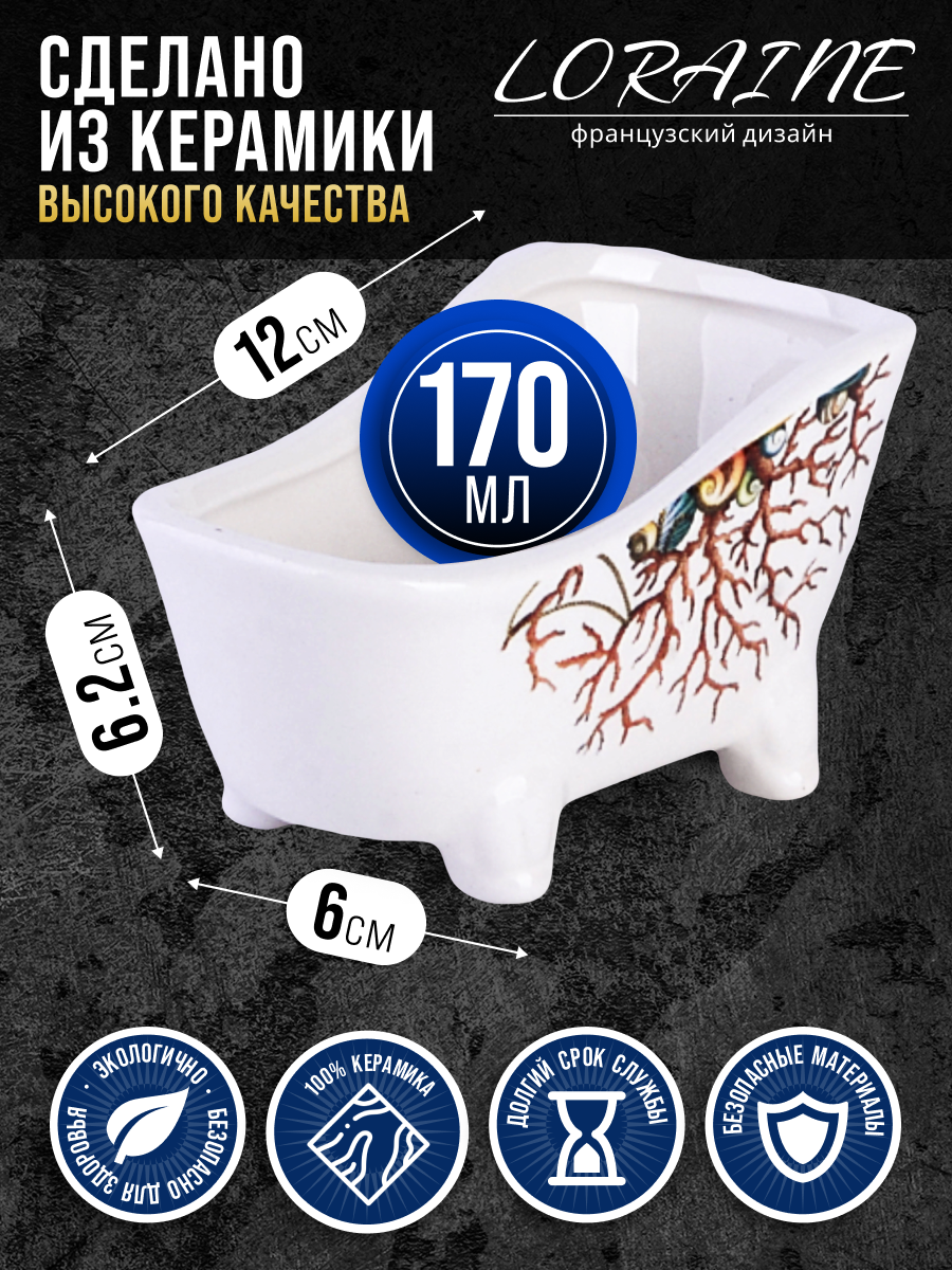 Подставка для губки LORAINE изготовлена из качественной доломитовой керамики. Оригинальная подставка выполнена в форме миниатюрной ванны на четырех ножках. Такая подставка является незаменимой вещью на каждой кухне, потому что теперь Вы всегда сможете класть мокрую после использования губку в одно и то же место, не оставляя ее на бортике раковины. Яркая и оригинальная, подставка LORAINE сочетает в себе современный дизайн с максимальной функциональностью, а красочность оформления придется по вкусу любой хозяйке. Изделие упаковано в индивидуальную коробку. Подходит для использования на кухне и в ванной комнате. Рекомендуется мыть руками.