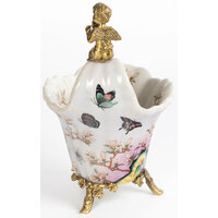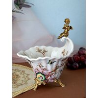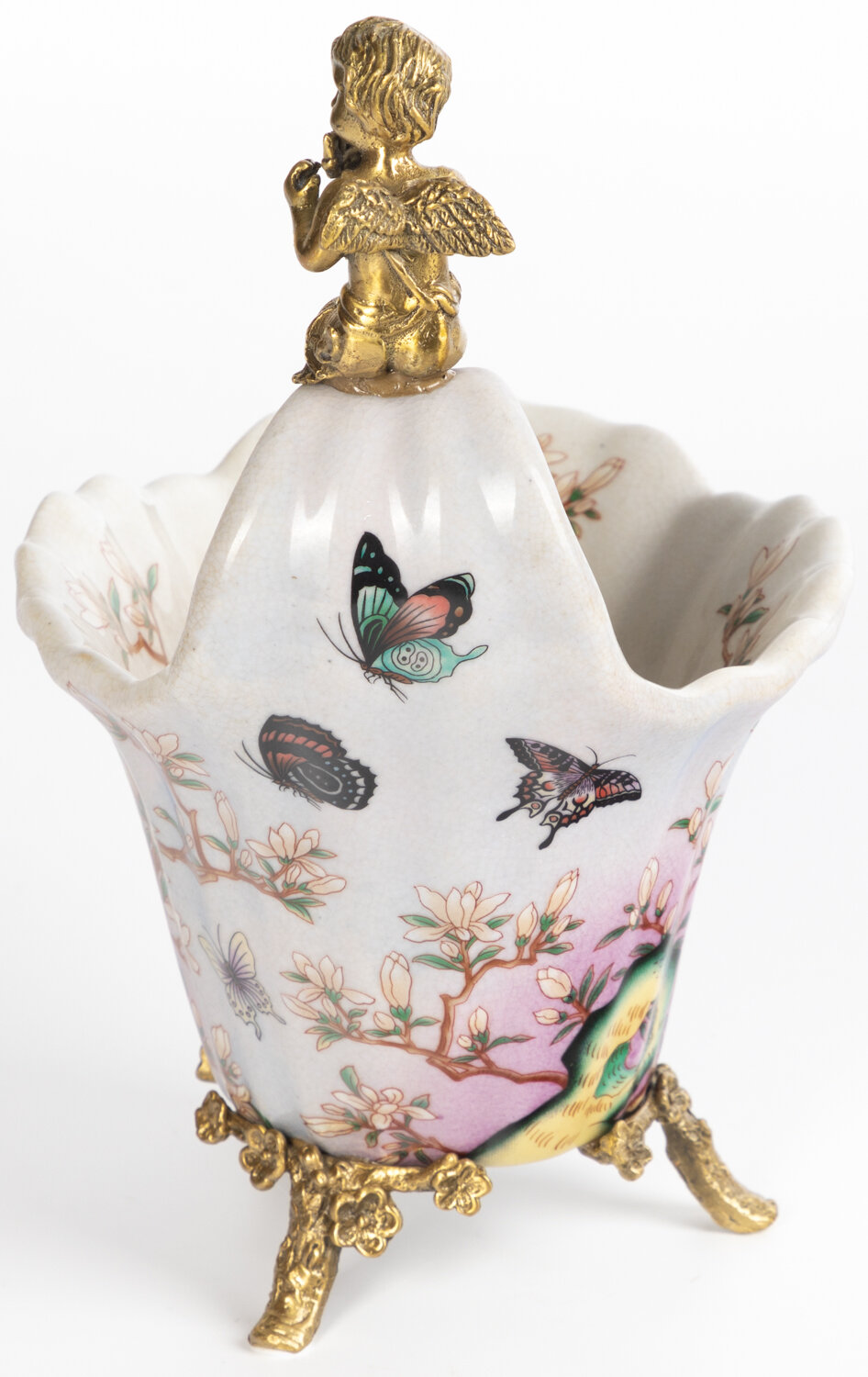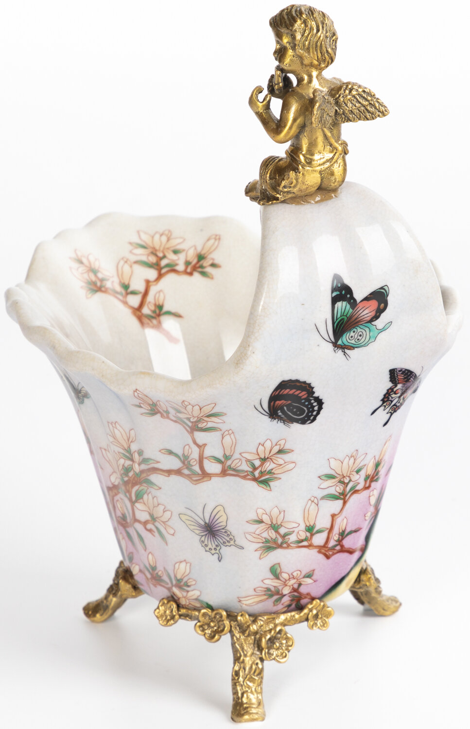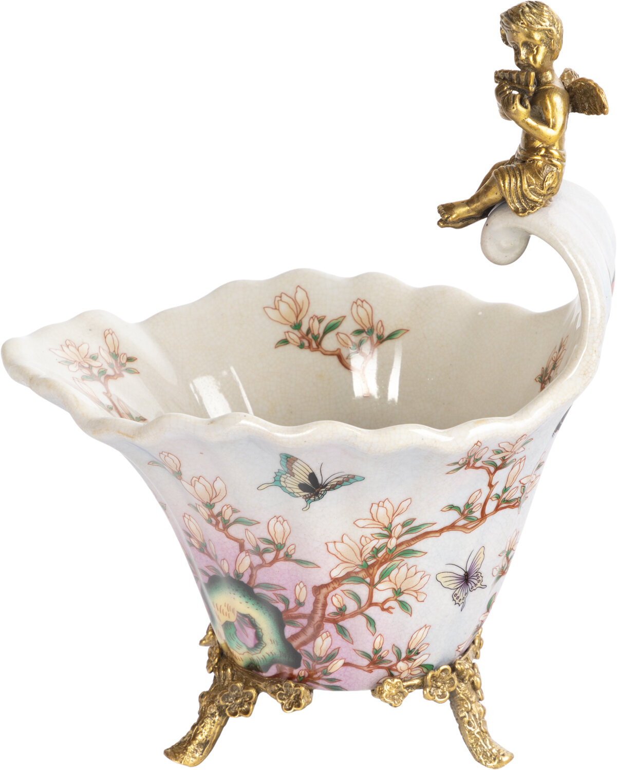 Чаша с ангелом, выполненная из фарфора с бронзовыми элементами. Уникальное изделие ручной работы. При производстве этих художественных изделий из фарфора с бронзой используются вековые традиции китайских мастеров. Видимые трещинки (кракелюры) делаются по уникальной технологии, что придает более благородный вид старинного изделия. Вес изделия: 1,25кг. Размер: 22х16х27см. Материал: Фарфор, бронза. Производитель: Китай.